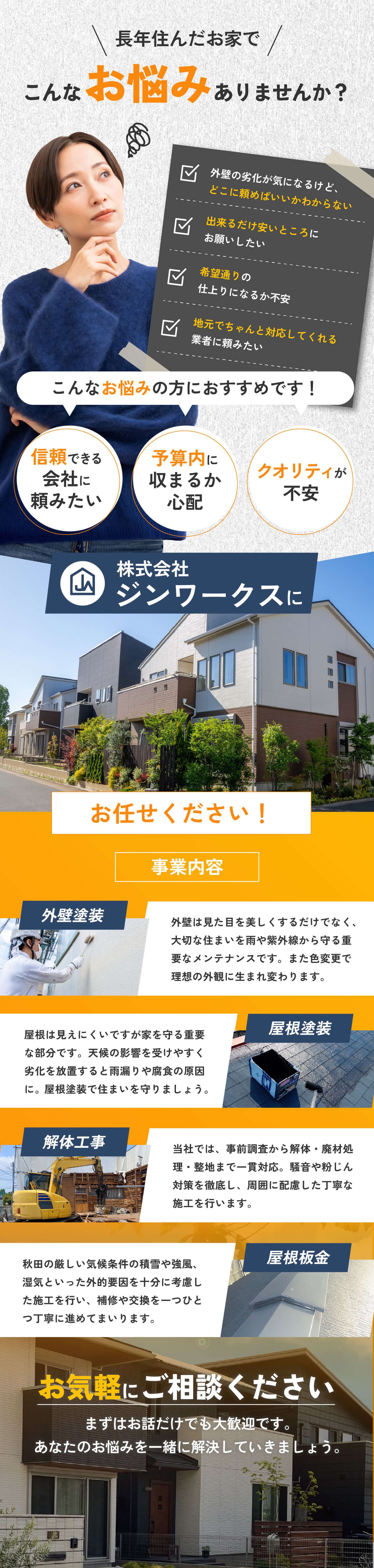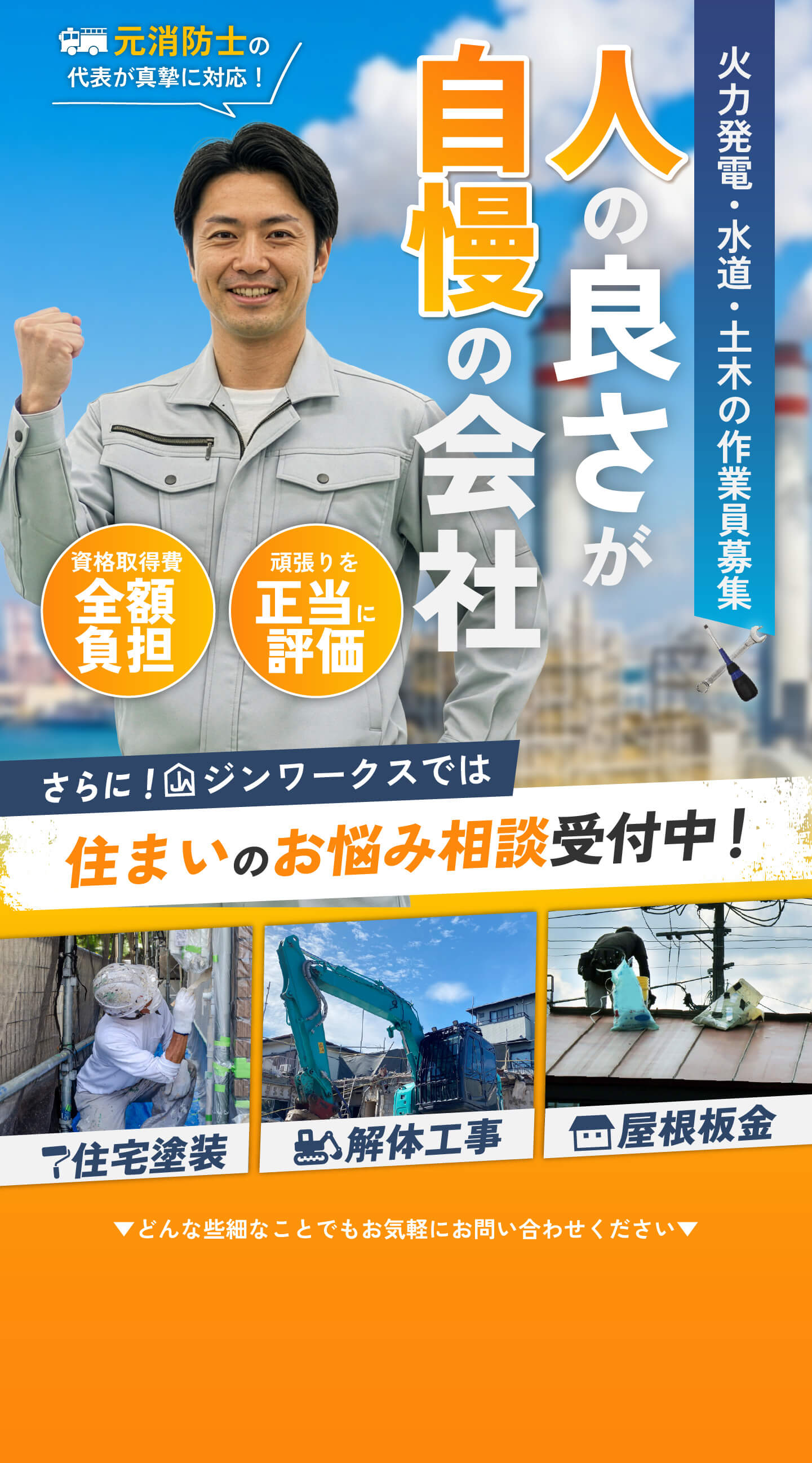 | 事業内容 | ・設備点検 ・清掃 ・解体 ・組み立て ・外壁塗装 ・解体工事 ・屋根板金 |